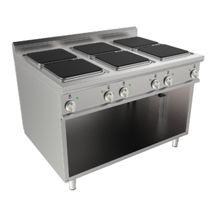 Piano di lavoro in acciaio inox AISI 304 scotch brite with spessore 2,0 mm stampato with impronta raccogli-liquidi. Struttura realizzata in acciaio AISI 304. Piastre quadrate in ghisa dim. 300×300 mm, potenza 4,0 kW cadauna a riscaldamento rapido, dotate di dispositivo di protezione termico. Commutatore a 7 posizioni per la regolazione di ogni piastra Lampade spia segnalano il funzionamento. Manopole in materiale atermico. Piedi in acciaio inox AISI 304 regolabili in altezza.